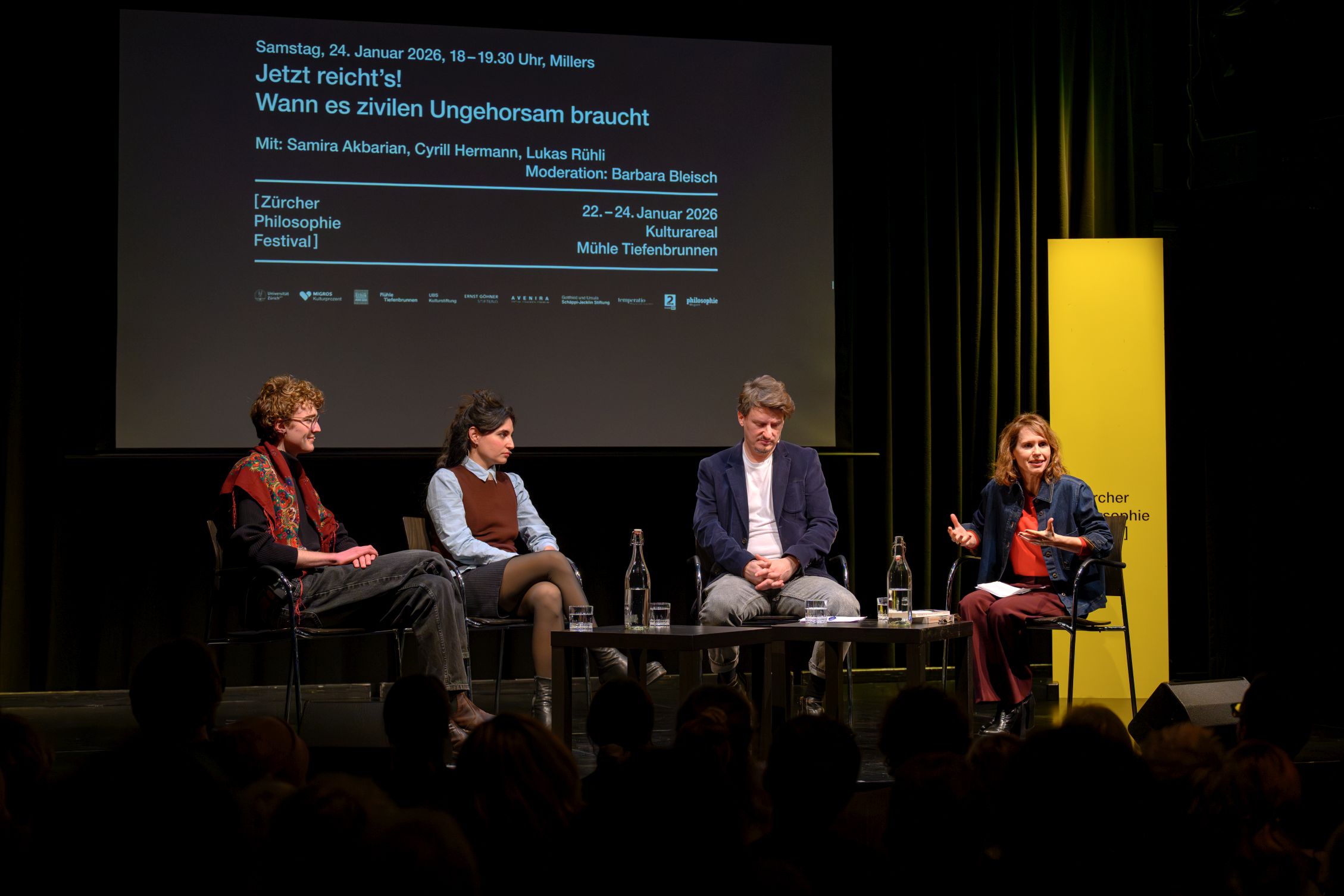 - Zürcher Philosophie Festival 2026: Cyrill Hermann, Samira Akbarian, Lukas Rühli, Barbara Bleisch © Maria Brunner